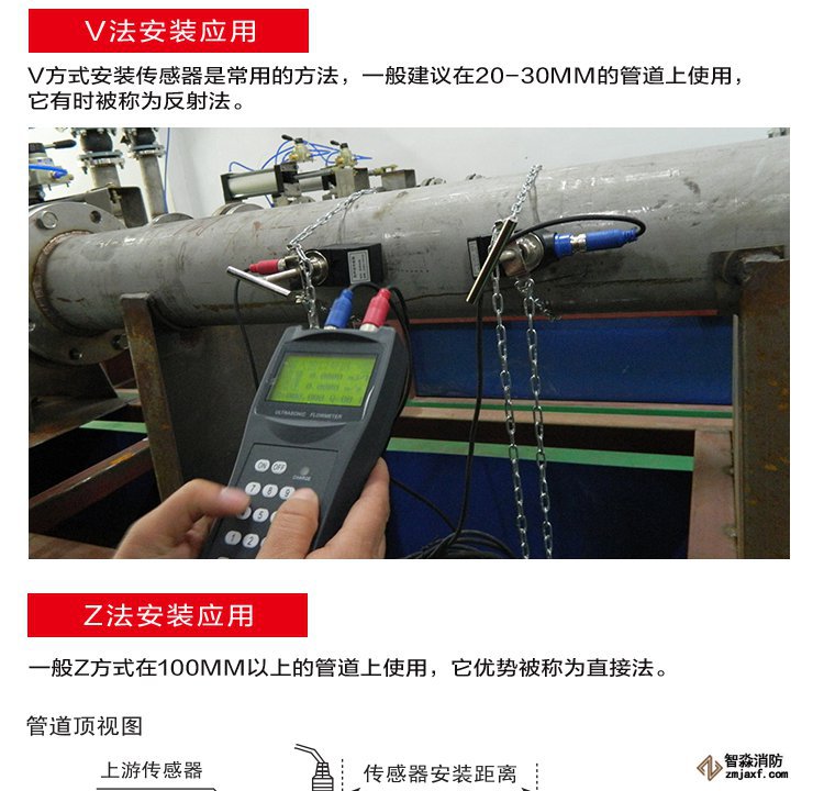 超聲波流量計的傳感器一般采用V方式和Z方式安裝,通常情況下,管徑小于300mm時,采用V方式安裝,管徑大于200mm時,采用Z方式安裝。對于即可以用V方式安裝又可以Z方式安裝的傳感器,盡量選用Z方式。實踐表明,Z方式安裝的傳感器超聲波信號強度高,測量的穩(wěn)定性也好,圖2。