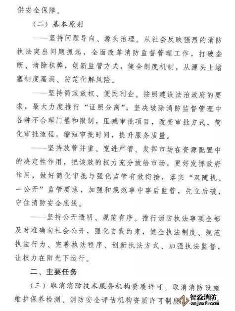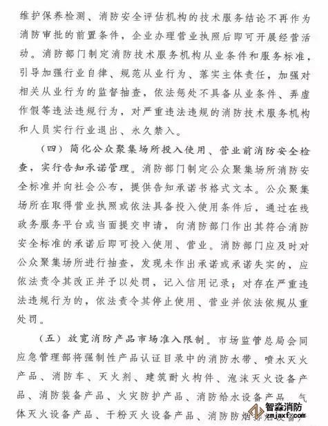 在簡(jiǎn)政放權(quán)方面,取消和精簡(jiǎn)3項(xiàng)消防審批。一是取消消防技術(shù)服務(wù)機(jī)構(gòu)資質(zhì)許可,取消消防設(shè)施維護(hù)保養(yǎng)檢測(cè)、消防安全評(píng)估機(jī)構(gòu)資質(zhì)許可制度,企業(yè)辦理營(yíng)業(yè)執(zhí)照后即可開(kāi)展經(jīng)營(yíng)活動(dòng)。二是簡(jiǎn)化公眾聚集場(chǎng)所投入使用、營(yíng)業(yè)前消防安全檢查,實(shí)行告知承諾管理,公眾聚集場(chǎng)所作出其符合消防安全標(biāo)準(zhǔn)的承諾后即可投入使用、營(yíng)業(yè)。三是放寬消防產(chǎn)品市場(chǎng)準(zhǔn)入限制,將強(qiáng)制性產(chǎn)品認(rèn)證目錄中的13類消防產(chǎn)品調(diào)整出目錄,改為自愿性認(rèn)證,僅保留公共場(chǎng)所、住宅使用的火災(zāi)報(bào)警產(chǎn)品、滅火器、避難逃生產(chǎn)品的強(qiáng)制性產(chǎn)品認(rèn)證;向社會(huì)開(kāi)放消防產(chǎn)品認(rèn)證、檢驗(yàn)市場(chǎng),凡是具備法定條件的認(rèn)證、檢驗(yàn)機(jī)構(gòu),均可開(kāi)展認(rèn)證、檢驗(yàn)工作。消防部門制定消防技術(shù)服務(wù)機(jī)構(gòu)從業(yè)條件和服務(wù)標(biāo)準(zhǔn)、公眾聚集場(chǎng)所消防安全標(biāo)準(zhǔn),引導(dǎo)加強(qiáng)行業(yè)自律、規(guī)范從業(yè)行為,加強(qiáng)監(jiān)督抽查,依法懲處違法違規(guī)行為,對(duì)嚴(yán)重違法違規(guī)的實(shí)行行業(yè)退出、永久禁入或者責(zé)令停止使用、營(yíng)業(yè)。