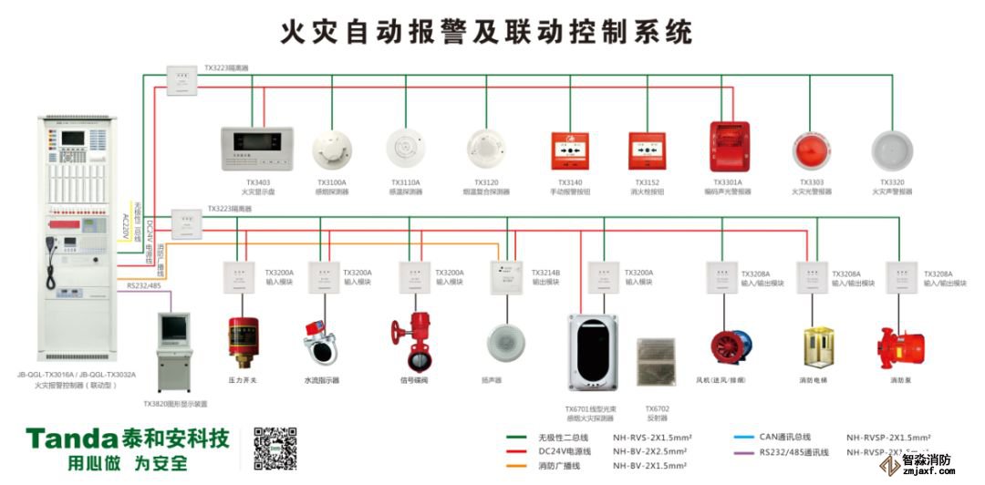 火災自動報警系統是探測火災早期特征,發出火災報警信號,為人員疏散、防止火災蔓延和啟動滅火設備提供控制與指示的消防系統。其中火災聲光警報器、火災顯示盤、輸入輸出模塊更是“二線制”的設計亮點,降低了施工接線的難度,大大提高施工效率!