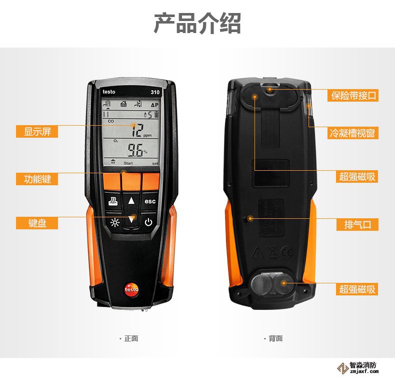 不僅如此,該手持式煙氣分析儀還具有多項其它實用特性。儀器背部帶有磁吸,可吸附于所有金屬表面,比如燃燒器外殼,方便您騰出雙手處理其他事務。傳感器自動調零,僅需30秒,過濾芯更換極其簡便。與此同時,testo 310輕便、堅固且耐用,防塵防撞擊,內置冷凝槽可快速簡便的清空。