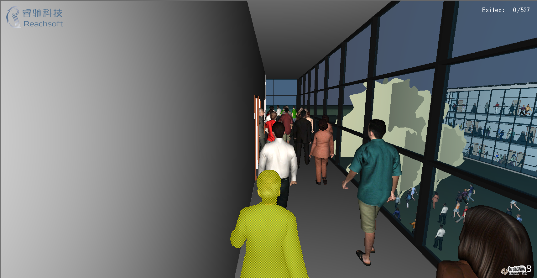 -Pathfinder還專門提供了高性能可視化的3D時間歷程模擬,利用透明化功能來更好地顯示密集人群在樓層中的疏散情況。