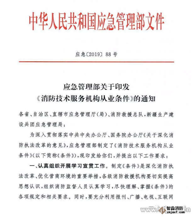 為深入貫徹落實(shí)中共中央辦公廳、國(guó)務(wù)院辦公廳《關(guān)于深化消防執(zhí)法改革的意見》,應(yīng)急管理部制定了《消防技術(shù)服務(wù)機(jī)構(gòu)從業(yè)條件》(以下簡(jiǎn)稱《條件》),現(xiàn)印發(fā)給你們,并提出以下工作要求: